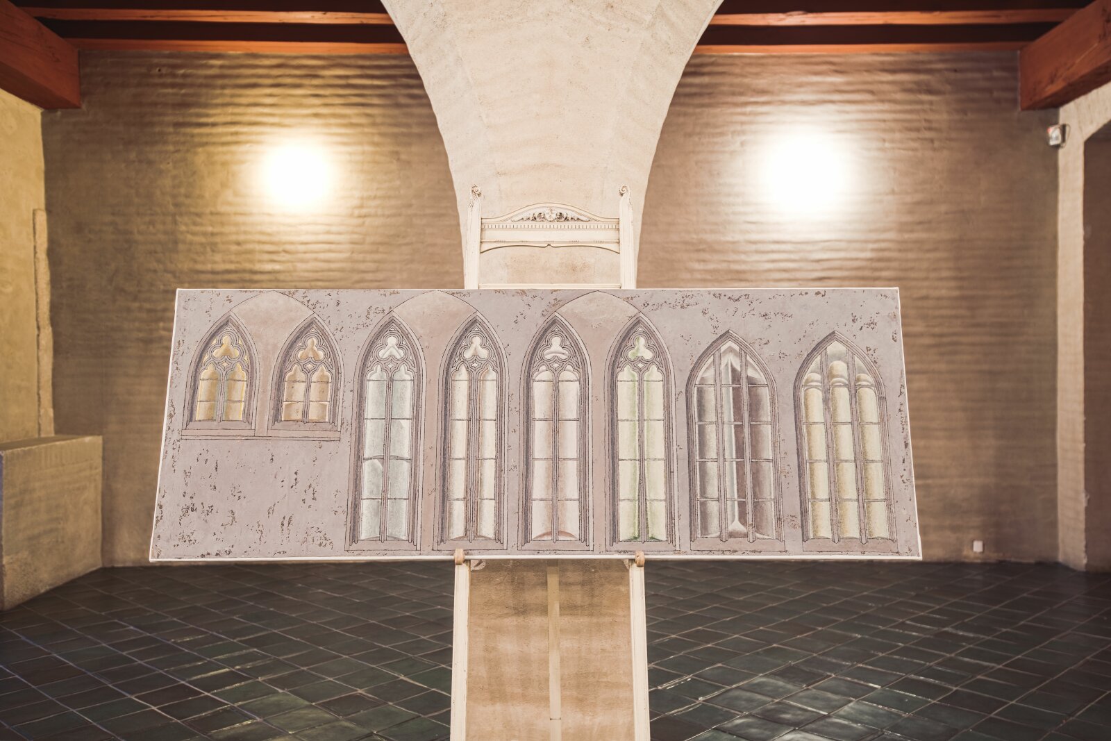 Ve výstavě se nachází také stojan s faksimilií – přesnou kopií – malířské studie vitráží.