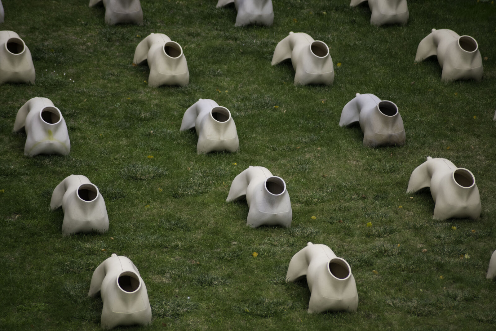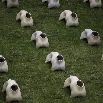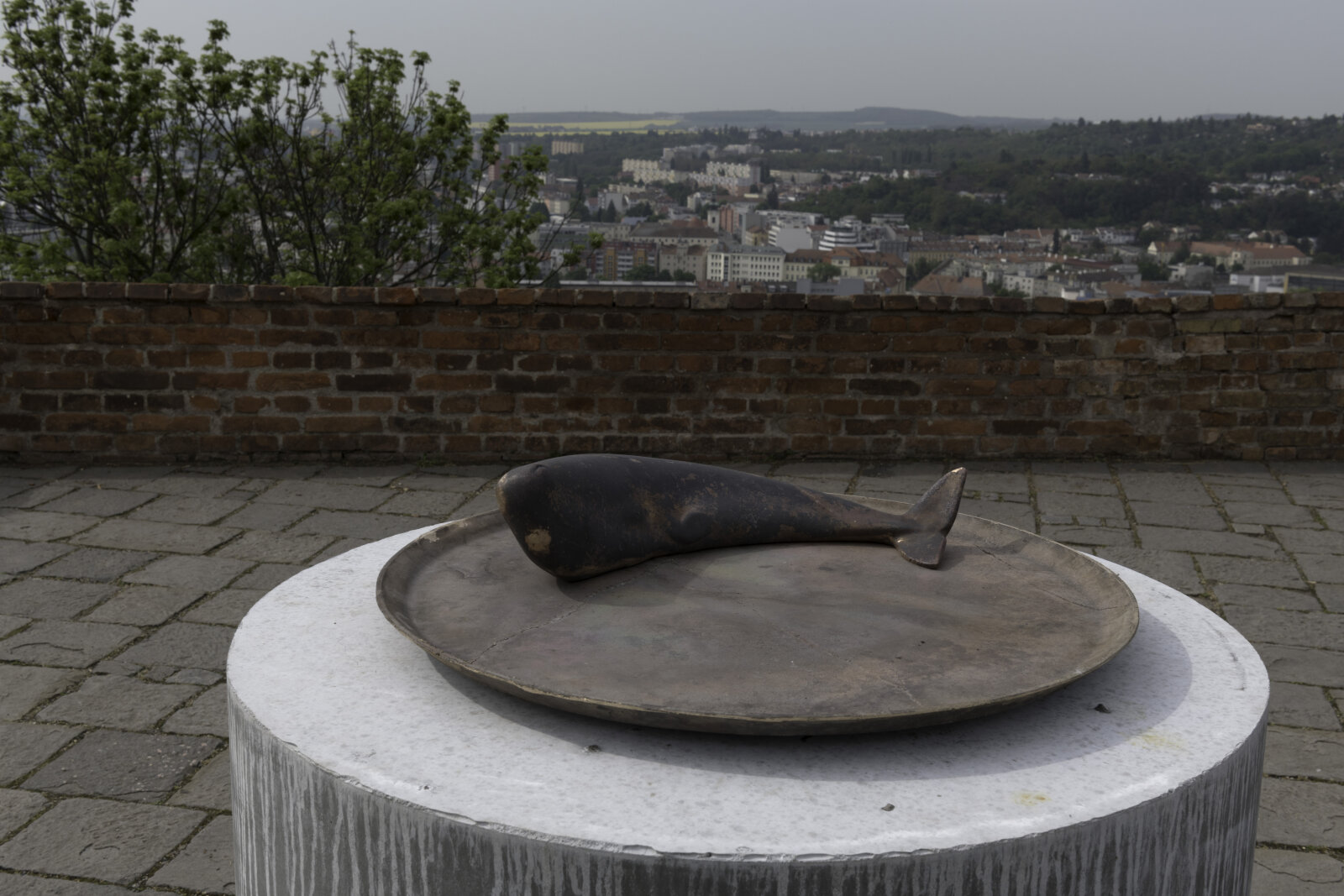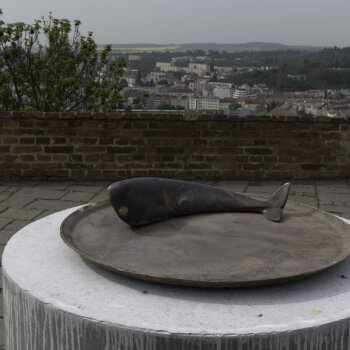 Adam Velíšek develops a variety of traditional sculptural techniques in his work. One of the most frequent is cast fired ceramic. This ancient technique, used in Mesopotamian and ancient Chinese art, testifies not only to Velíšek's ability to master technologically demanding processes, but also to his respect for the values of the past. In his artistic thinking, Velíšek focuses on the layering of movement in individual time sequences, as well as on the principle of variability and the multiplication of the initial form into numerous structures. A striking example is the Army series (2013-2022) consisting of sixty-six identical dog torsos. Here Velíšek strictly suppressed the language of the symbol and the meaning of specific reference signs, focusing instead on the most consistently unified form, both of each torso and of the whole structure. The authenticity of each individual of this canine army, his dignity and responsibility for the actions performed, is thus shattered and transformed into a disembodied monotonous mass. An interesting counterbalance to this large-scale installation is Sperm Whale (2023), in which Velíšek worked with the concept of a single statue - a sperm whale stranded in the shallows - which he cast in traditional bronze and placed on an oversized concrete plinth. By the tension between the two chosen materials and the concept of both forms, i.e. the brutalist base and the sensitively modelled sculpture, Velíšek enhanced the appeal and importance of this ecologically motivated message.
