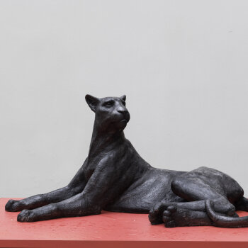 Irena Armutidisová has continuously focused on the topic of animals since her studies. Apart from anatomy, which differs from one animal species to another and offers an endless variety of sculptural solutions, she is interested in the possibilities of capturing both real and latent movement present in the body of animals even when they are resting. She likes to personify the nature of animals into her or the human world. The very choice of the animal therefore reflects the artist's feelings, emotions and current state of mind. For her, Jaguar (2021) is a symbol of a dream come true, a childhood desire for a fluffy toy from a petrol station which she never got, and which she transformed many years later into a life-size statue, a kind of sphinx guarding this childhood dream. Similarly, she has been fascinated by Hyenas (2018) since childhood, especially by their casting in the role of negative characters, whether in the world of animals or, in a metaphorical sense, in the world of humans. In contrast to established stereotypes, she therefore portrayed hyenas as inquisitive creatures with intelligent expressions and noble bodies. The sculptural concept of both exhibited works reveals that Armutidisová’s oeuvre draws on the legacy of the Italian sculptor Rembrandt Bugatti, with whom she shares a sense of a realistic grasp of sculpture which she transcends towards expressiveness and light stylization. As a result, Armutidisová’s sculptures have an unmistakable expression and vividness and speak to the viewer with subtle humour and gentle exaggeration.