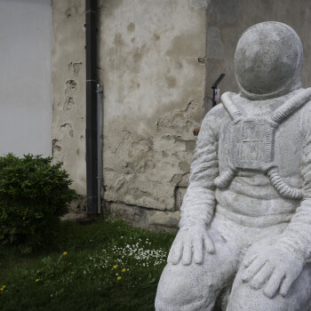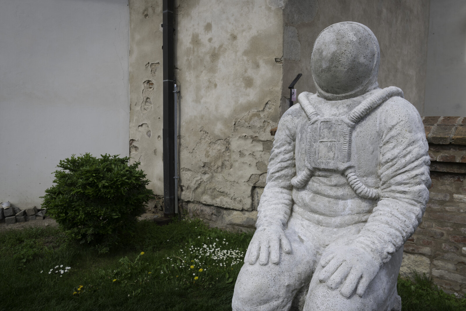 Vesková also offers significant overlaps in the effect and content of her sculptural work in The Last Astronaut (2020). It is executed in a monumental, almost archaic sculptural language in white concrete. The figure, sitting upright with his hands on his knees, resembling a seated pharaoh, is the last man sitting on the Moon, watching the decline of the Earth in stoic calm. In this respect, the figurative sculpture becomes the personification of a catastrophic vision of the end of our planet.
