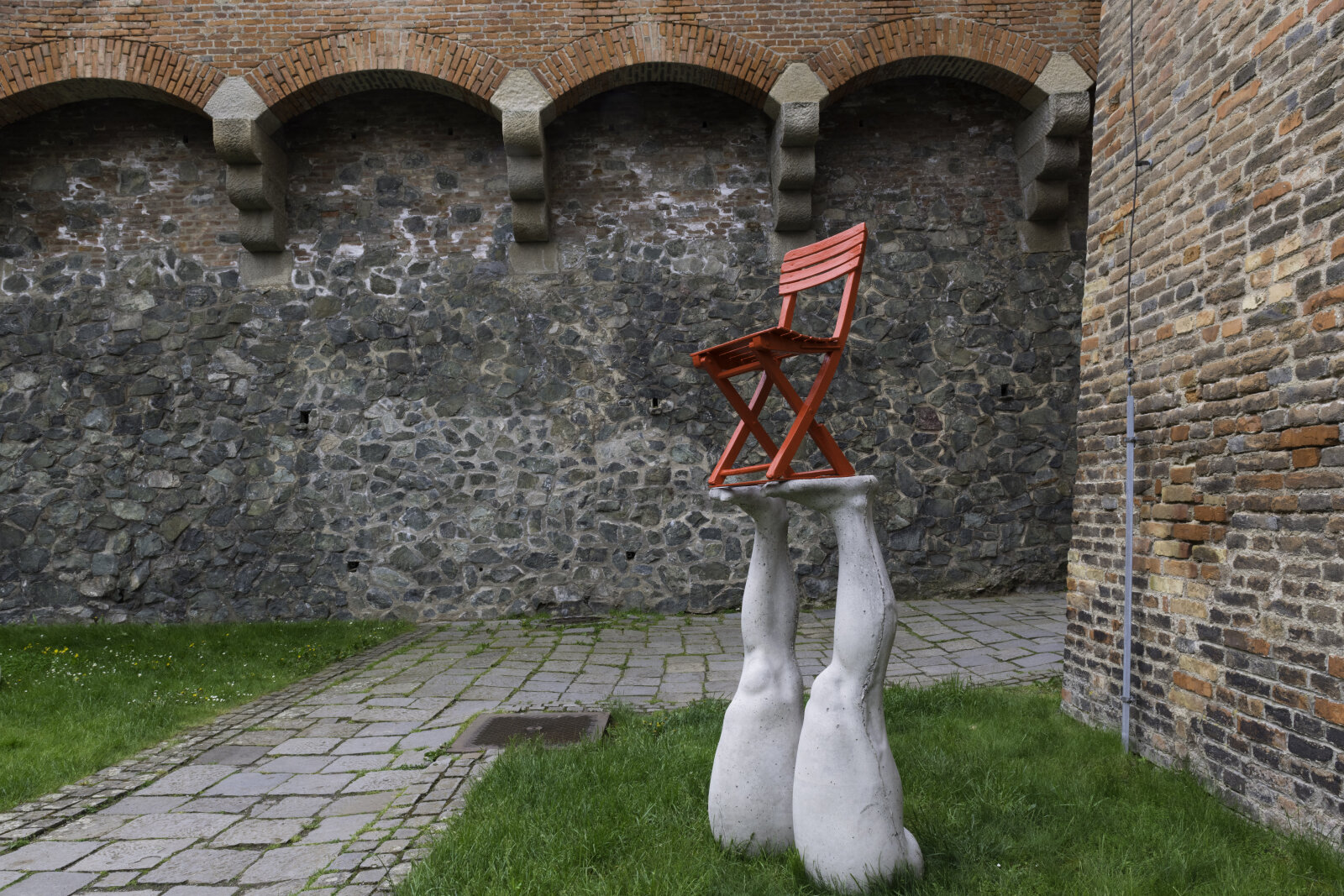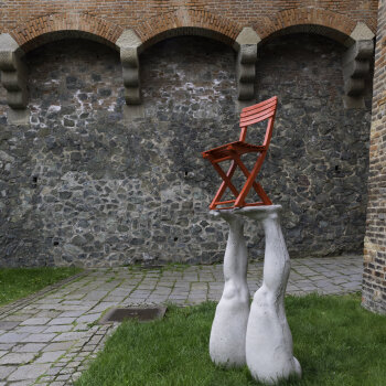 Zuzana Kantová has long centred on the phenomenon of femininity, which in her concept carries a very specific symbolism of the woman as an archetypal figure. The sculpture Seating Unit (2013) builds on Kantová's diploma work Six Thighs and innovatively reconsiders the view on one of the erotically-tinged symbols of female beauty, exposed legs. Since the artist used her own limbs as a model, the resulting work not only manifests the parameters of sensitive modelling and an understanding of anatomical structure, but also evokes the vulnerability and fragility of female skin through its casting in smooth concrete. However, the final upward orientation of the feet and the oversized thighs will eventually invite the viewer to radically rethink his or her ingrained attitude and see women's legs as utilitarian "plinths" that support the main part of the work, red garden chairs. In this context, the very subject of the sculpture becomes a paradox within which the counter-position - the legs sticking up in a demeaning position and chairs at a dysfunctional height - becomes the central irritating element that doesn’t leave the viewer cold and mercilessly demolishes one social stereotype after another.