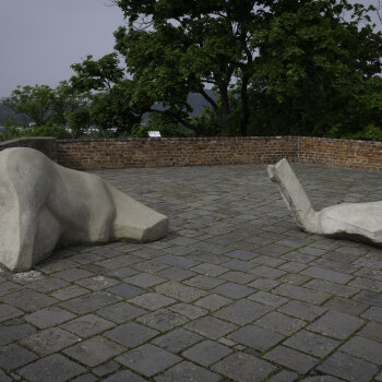 Jakub Goll's work is characterized by monumentality of form and a generous approach. His starting points go back to prehistoric times when sculpture naturally emerged from forms such as found stones. Goll is passionate about working with archaic artistic language, especially with reference to Sumerian and Egyptian sculpture which he translates into modernist expression. The sculpture Wounded Animals (2016) reflects an authentic experience in the cliffs of the Basque Country, where the artist saw a fallen donkey on a sandy ground. Struck by the event, and at the same time overwhelmed by the formations of the surrounding landscape, he created two monumental sculptures whose zoomorphic features blend into natural formations while the motif itself resonates in a vague indication.